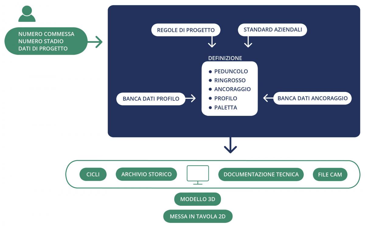 L'operatore si limita ad introdurre a sistema i dati gestionali necessari ad identificare l' appartenenza (numero di commessa e numero di stadio) e la possibilità di confermare o eventualmente modificare i dati di progetto proposti automaticamente dal sistema. Successivamente la procedura si sviluppa in automatico richiedendo solamente delle conferme da parte dell' operatore, fino alla generazione finale del modello 3D, dei relativi disegni e dei dati necessari per le lavorazioni CAM.